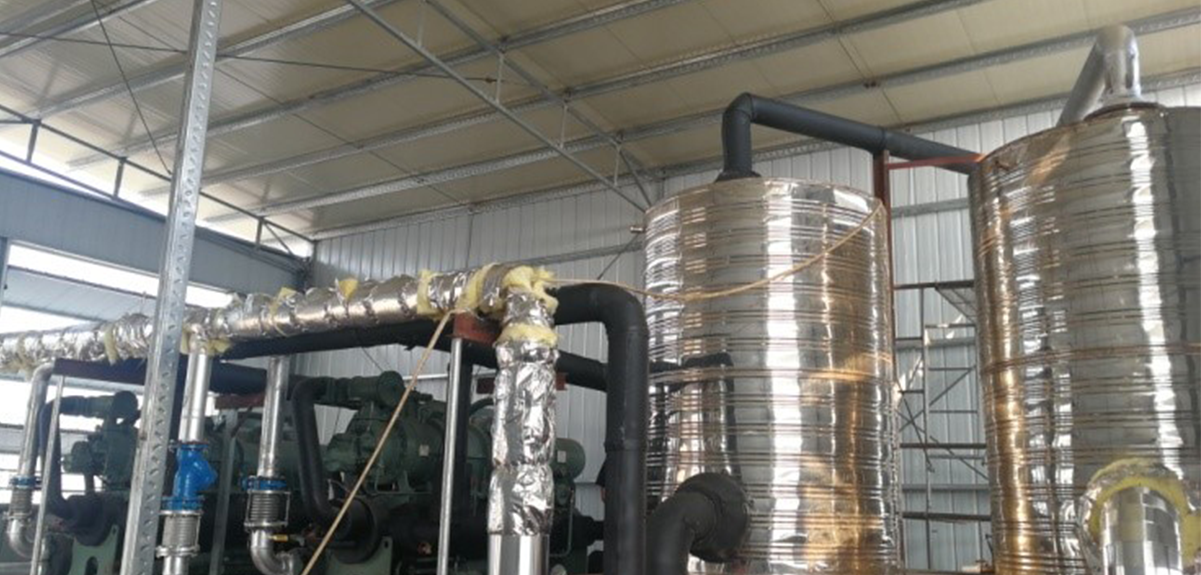 Collagen production line, the unit is mainly used to deal with the drying process. One HANBELL LT-S-H two-stage high-temperature heat pump compressor is used. The inlet and outlet water temperature of hot water is 80/85℃ and the inlet and outlet water temperature of evaporator is 18/13℃. It can provide cold and heat sources for the combined air cabinet, so as to maximize the energy efficiency and to solve the problems of drying temperature and drying speed. The maximum temperature of conventional water source heat pump is 65℃ and the maximum temperature of hot air is about 55℃. Using LT-S-H, the water outlet can reach 85℃ and the air outlet can reach about 75 ℃, so as to achieve efficient and fast drying speed.