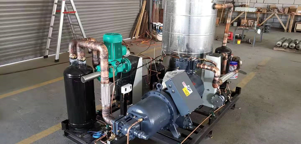 某地能源所實驗製作一個高溫熱水機的樣機,可以用來直接出熱水和蒸汽。機組選用漢鐘精機RC2-T系列餘熱回收超高溫熱泵壓縮機,採用R245fa冷媒,蒸發器水溫50℃以上,冷凝器水溫120℃,制熱量100KW。
