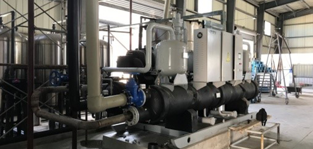 工生產車間,高氯酸鉀電解、蒸餾提純。機組採用1台漢鐘精機RC2-G系列餘熱回收高溫熱泵壓縮機,用給電解液降溫的40℃左右的冷卻水作為熱源水,通過高溫熱泵提供70-80℃的熱水給蒸餾塔提供熱量,同時實現給電解液降溫至45℃左右。